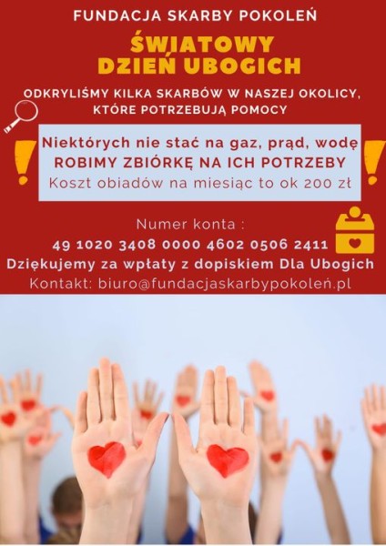 Z tej okazji uruchomiliśmy zbiórkę na rzecz Skarbów lokalnych, które potrzebują naszej pomocy. Chcemy na zimę kupić i dostarczać im ciepłe obiady, bo niektórzy żyją bez prądu, wody, gazu.